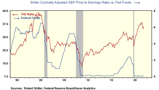 在CAPE接近历史高位的情况下,即使美联储没有改变政策,股票投资者也会高估回报,误判风险。再加上官方利率上调200-300个基点,股价大幅回调20%-30%并非不可能。