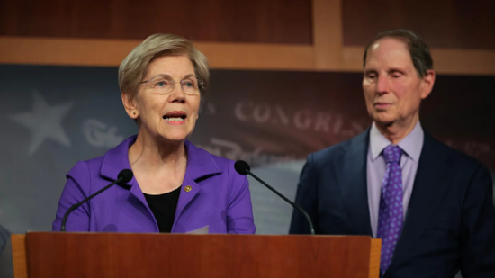 2025 年 2 月 3 日,参议员伊丽莎白・沃伦与罗恩・怀登在国会大厦共同发声。
