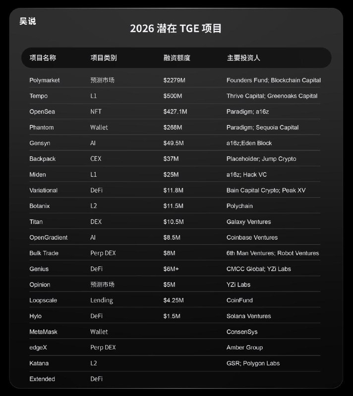吴说统计了 20 个可能在 2026 年进行 TGE 的项目,包括 Polymarket、Tempo、Opensea、Backpack、Gensyn、Botanix 等,涵盖预测市场、L1、L2、NFT、Wallet、AI、Perp DEX 等赛道。