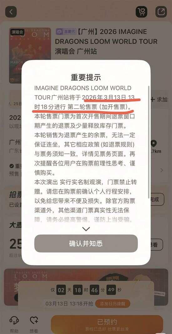 ▲该场演唱会平台显示二开时间为3月13日。