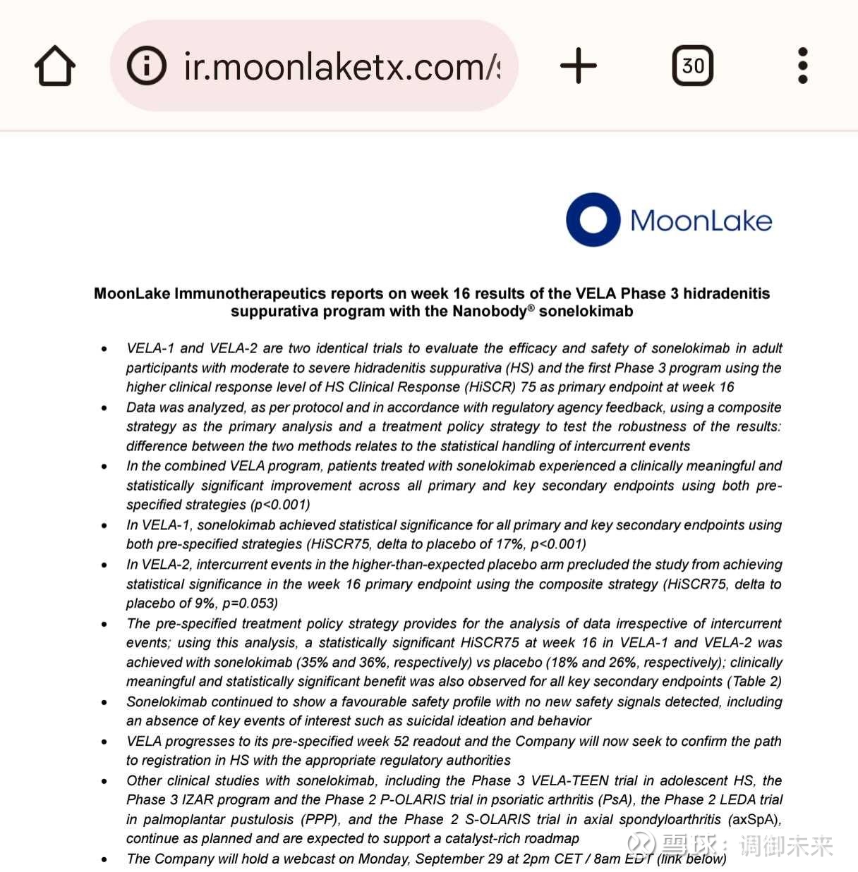 MoonLake Immunotherapeutics(NASDAQ: MLTX)唯一核心管线 sonelokimab 银屑病 III 期第二次中期分析疗效差异不足30%,SAE翻倍,股价单日-89%,现金仅够烧到2025Q4,宣布“寻求战略替代方案”——实质卖壳。