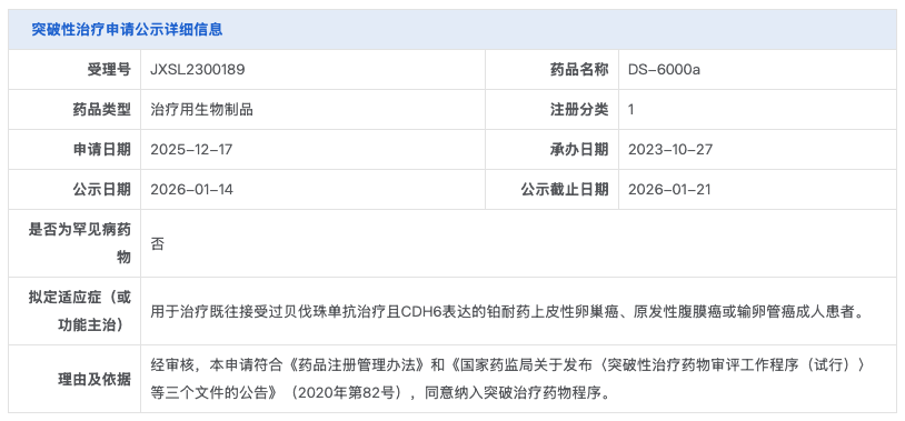 Inisght 数据库显示,DS-6000a 是全球进展最快的 CDH6 ADC,此前曾获得美国 FDA 授予的突破性疗法资格。