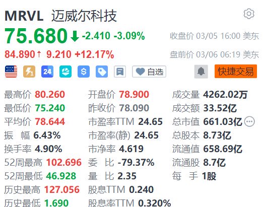 格隆汇3月6日|迈威尔科技(Marvell)美股盘前涨超12%,报84.89美元。消息面上,公司最新财报业绩和营收展望双超市场预期。