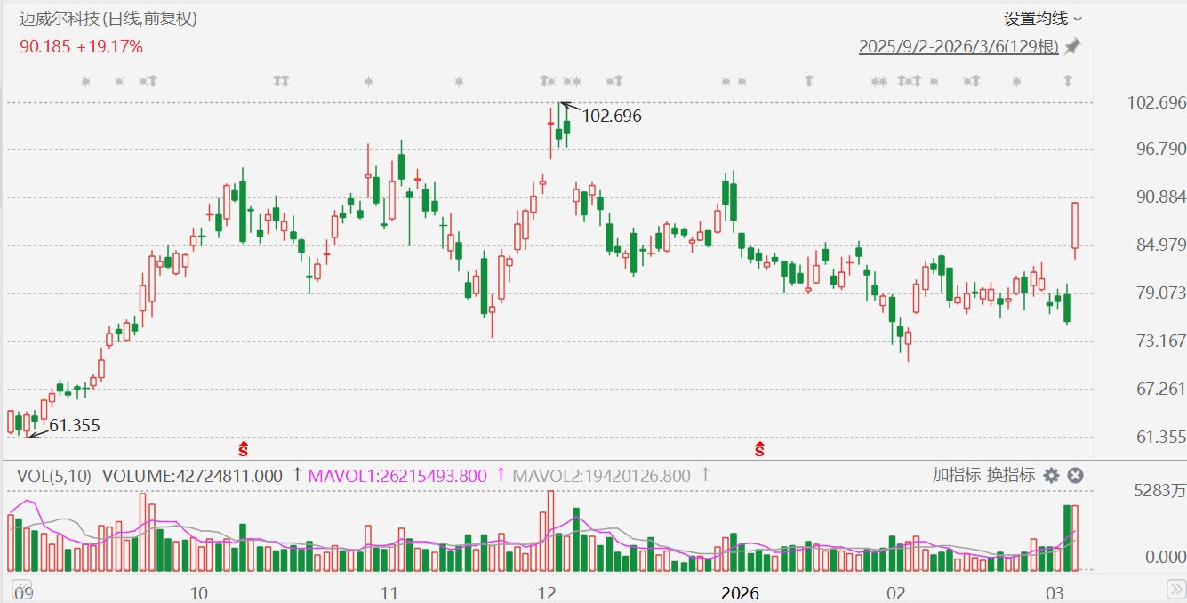 格隆汇3月7日|迈威尔科技(MRVL.US)盘中大涨超19%,报90.23美元。消息面上,公司最新财报业绩和营收展望双超市场预期。