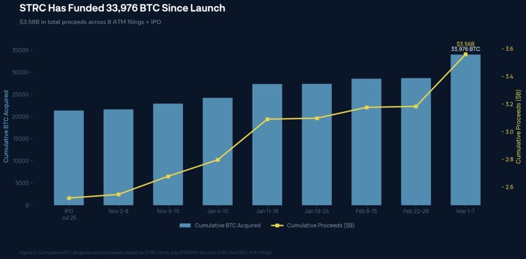 吴说获悉,据 Delphi Digital 研究,Strategy 通过 STRC 浮动利率永续优先股(面值 $100,当前股息率 11.5%,3月连续第7次上调)将固定收益资本高效转化为现货 BTC 买盘。3 月 9–15 日一周,ATM 发行售出约 1,181.8 万股,净募资 11.804 亿美元(占当周总融资 15.764 亿的大部分),买入 22,337 枚 BTC,创 2026 年单周最大购买纪录。自 2025 年 7 月推出以来,STRC 已成为其 BTC 积累核心工具,单日峰值可资助超 4,000 枚、单周最高推动 7,000+ 枚入账,远超每日新挖矿供应。但年度股息义务已逼近 10.5 亿美元,优先股占比过高,对普通股股东带来显著稀释与现金流压力。