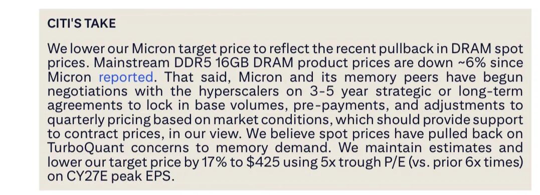 花旗3月31日发布美光研究报告,将目标价从510美元下调至425美元,理由是DDR5现货价格走软与TurboQuant担忧。
