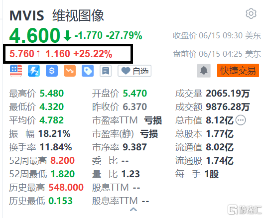 维视图像(MVIS.US)盘前涨超25%,报5.76美元。公司宣布因股价波动取消公开发行股票。