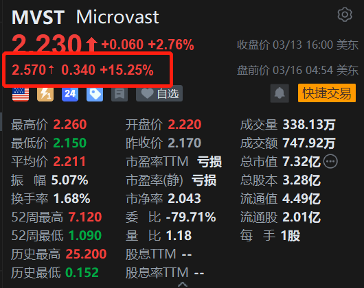 格隆汇3月16日|Microvast(MVST.US)美股盘前涨超15%报2.57美元。消息上,Microvast将于美东时间03月16日盘后发布财报,机构预期Microvast2025Q4预计实现营收1.31亿美元,同比增加15.87%;预期每股收益-0.03美元,亏损同比缩窄88.46%。上述数据使用的会计准则为US-GAAP。