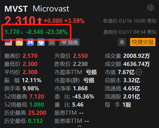 锂电池公司Microvast(MVST.US)盘前大幅下跌超23%。消息上,Microvast公告2025年第四季度每股调整后亏损为0.11,较一年前的每股亏损0.01有所扩大。分析师预计每股收益为0.02;营收同比下滑15%至9640万美元,远低于市场预期的1.314亿美元。管理层表示,将在应对关税和地缘政治不确定性的同时,优先保护利润率,并追求在重工业、公共交通等高壁垒细分市场的增长。