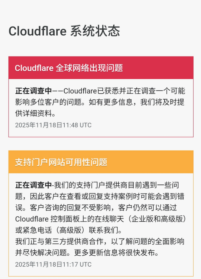 最讽刺的是,Cloudflare自己的状态官网也一度宕机,用户连报错都找不到地方报。企业客户和普通用户只能干瞪眼,毫无应对之策。