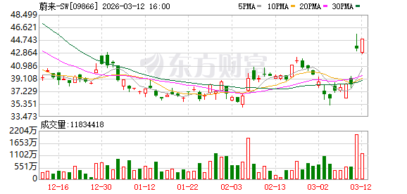 业绩表现直接推动了股价走势,当晚蔚来美股高开高走,开盘不久涨超8%,盘中多次涨幅扩大,最终报收5.7美元,上涨15.38%。资本市场的传导还在继续,3月11日,蔚来港股以43.86港元的价格高开,最终报43.5港元/股,收涨14.05%,时隔一年多重回千亿市值阵营。