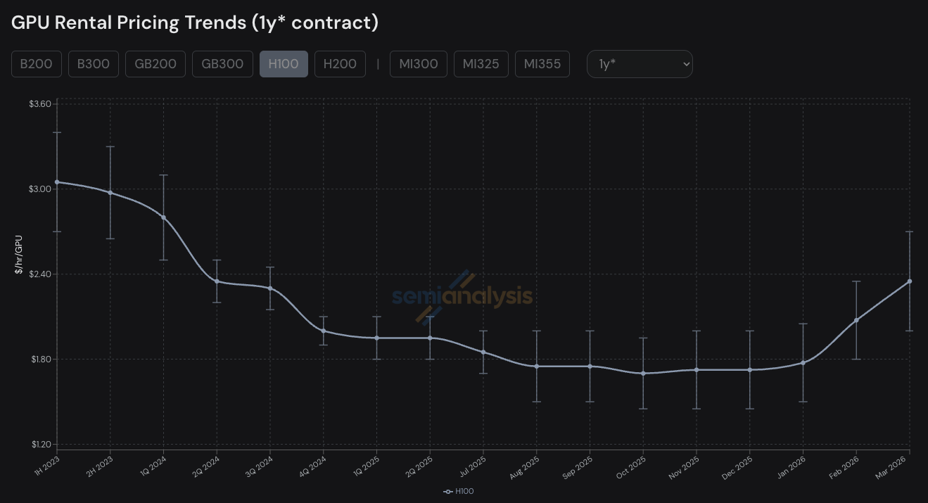 据半导体研究机构SemiAnalysis周四推出的“H100一年期租赁合约价格指数”,这款“老芯片”的租赁合约价格从2025年10月触及每小时1.7美元后,已经在今年3月飙升至每小时每块GPU 2.35美元,飙升近40%。