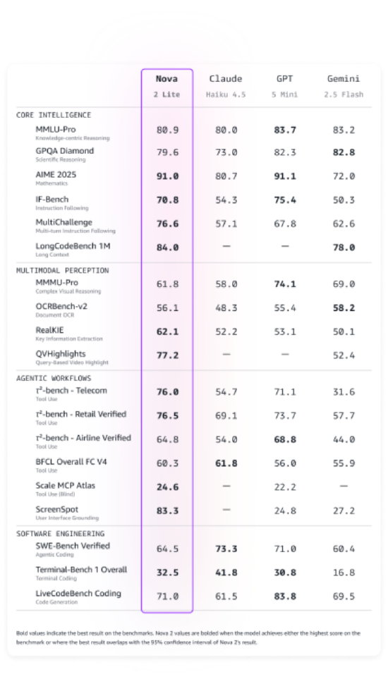 其中,Nova 2 Lite是一款面向日常工作负载的快速、经济型推理模型,能够处理文本、图像和视频输入并生成文本输出。与Claude Haiku 4.5相比,该模型在15项基准测试中有13项持平或更优;与GPT-5 Mini相比,在17项基准测试中,有11项持平或更优;与Gemini Flash 2.5相比,在18项基准测试中有14项持平或更优。Nova 2 Lite在以下能力上尤为突出:处理各类文档、从视频中提取关键信息、生成代码、提供准确的基于事实的回答,以及自动化执行多步骤的Agent工作流。