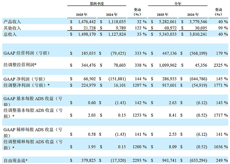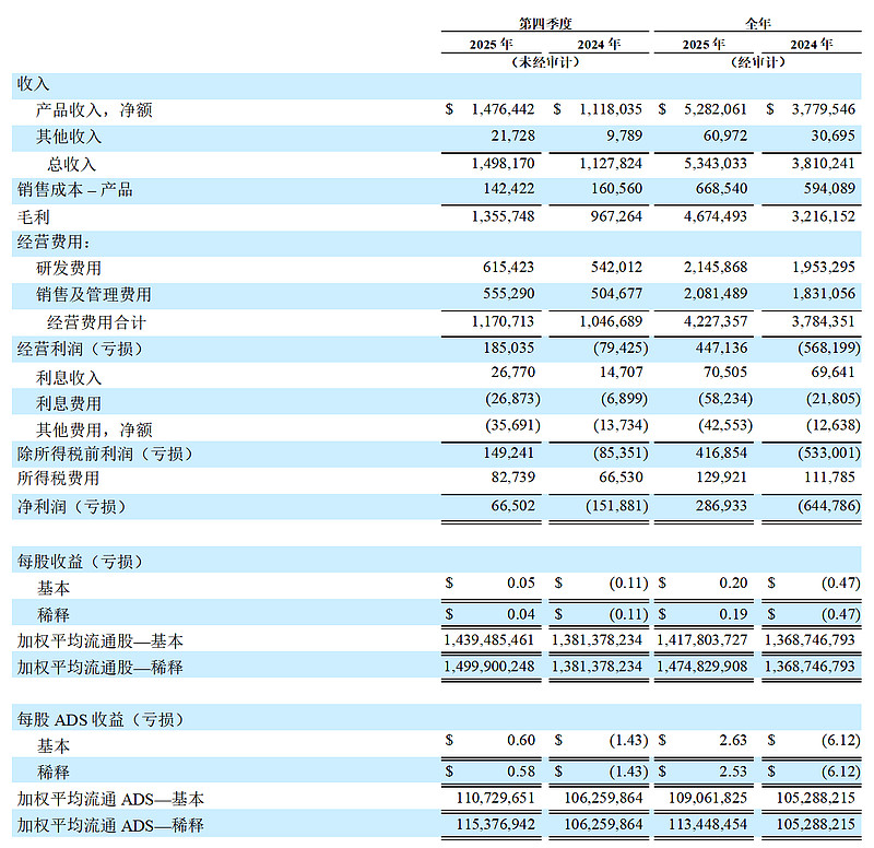 2025年第四季度,基本和稀释每股收益分别为0.05美元和0.04美元,基本和稀释每股ADS收益分别为0.60美元和0.58美元,上年同期基本每股亏损为0.11美元,基本每股ADS亏损为1.43美元。2025年全年,基本和稀释每股收益分别为0.20美元和0.19美元,基本和稀释每股ADS收益分别为2.63美元和2.53美元,上年同期基本每股亏损为0.47美元,基本每股ADS亏损为6.12美元。