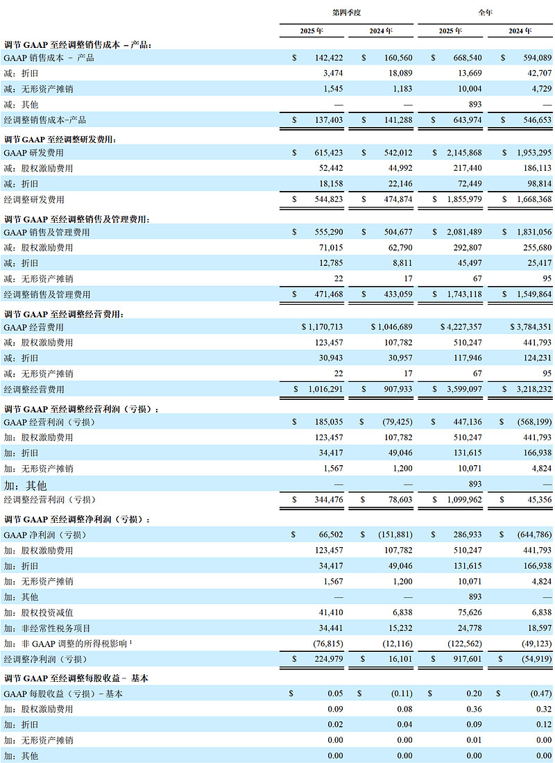 2025年第四季度和全年,GAAP净利润为6,700万美元和2.87亿美元,与上年同期净亏损相比分别增加2.18亿美元和9.32亿美元,主要得益于收入增长及经营杠杆改善。2025年全年GAAP净利润包括7,600万美元的股权投资减值费用、2,500万美元的非经常性税务项目费用,以及在特定司法管辖区因时间性因素产生的2,000万美元税务费用,这些费用主要发生在第四季度。