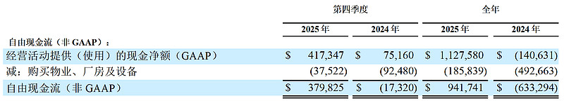 自由现金流:2025年第四季度,自由现金流为3.8亿美元,比上年同期增加3.97亿美元。2025年全年,自由现金流为9.42亿美元,比上年同期增加16亿美元。