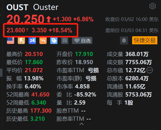激光雷达制造商Ouster(OUST.US)盘前涨16.5%报23.6美元。消息上,Ouster报告称2025年第四季度每股摊薄收益为0.06,而一年前则亏损0.48。截至12月31日的三个月内,公司收入为6,220万,高于一年前的3,010万。对于26年第一季度,Ouster公司预计收入在4,500万至4,800万之间。分析师预计收入为4,270万。(格隆汇)