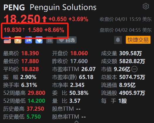 Penguin Solutions(PENG.US)盘前涨8.66%报19.83美元。消息上,Penguin Solutions于4月1日发布了2026财年第二季度财报。这是一份业务结构剧烈分化、但整体超预期并上调全年展望的成绩单:集成内存业务同比增长63%成为核心引擎,而先进计算业务因战略转型同比下滑42%,拖累总营收下降6%。