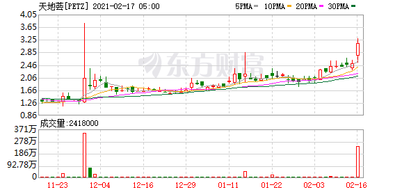 天地荟(PETZ.US)盘前股价急升,一度涨超517%,高见19.32美元。目前涨411.5%。