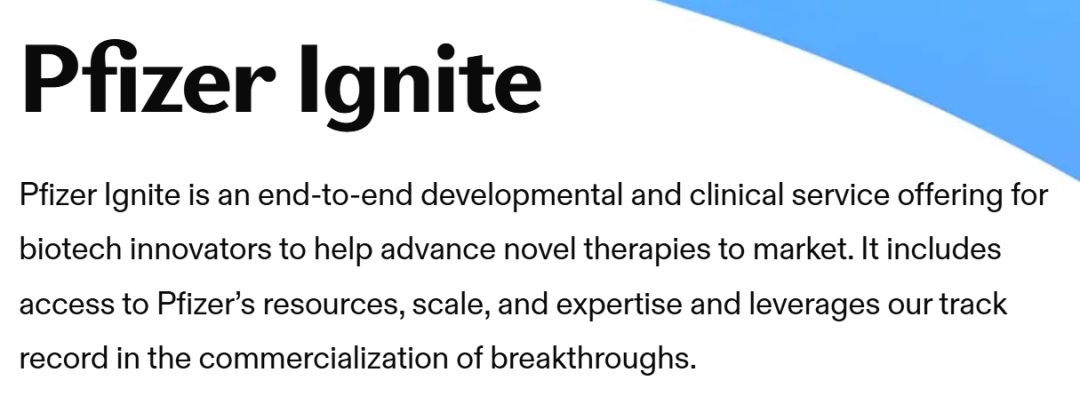 辉瑞 lgnite 计划于2020年前后被推出。根据辉瑞官网介绍——“ lgnite 计划面向生物技术创新者的端到端开发和临床服务,通过这一计划,辉瑞将与生物医药创新企业结成合作伙伴,充分发挥辉瑞在行业资源、专业技术、规模化研发运营等方面的优势,以及长期成功实践的丰富经验,助力合作伙伴的生物医药创新加速研发。