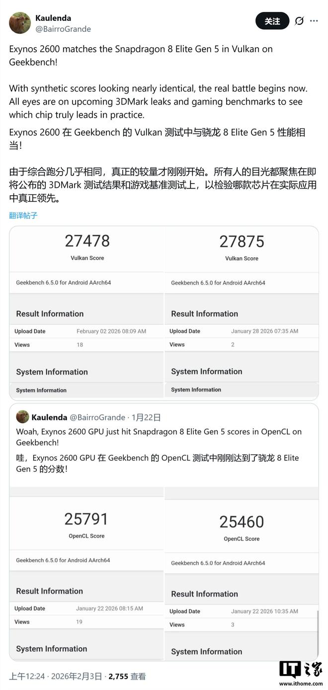 IT之家 2 月 3 日消息,科技媒体 Wccftech 昨日(2 月 2 日)发布博文,报道称在 Geekbench Vulkan 测试中,三星 Galaxy S26 系列手机搭载的 Exynos 2600 得分为 27478 分,媲美高通第五代骁龙 8 至尊版芯片(27875 分)。