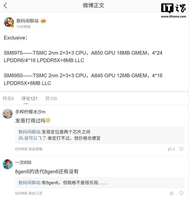 IT之家 3 月 25 日消息,高通下一代骁龙 8 至尊版旗舰处理器的信息曝光,博主 @数码闲聊站 今日爆料了 SM8950 和 SM8975 两个版本的配置:
