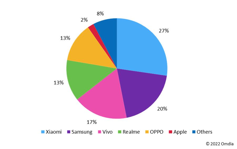 图1:按制造商划分的智能手机出货量(2021年)。