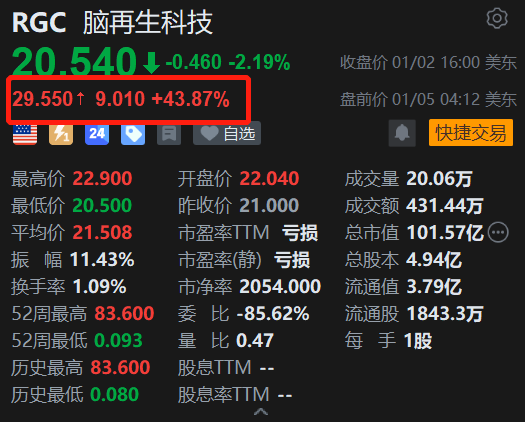 格隆汇1月5日|受港A市场脑机接口大涨带动,脑再生科技(RGC.US)美股盘前飙涨近44%。消息上,马斯克“量产预告”催化,导致脑机接口概念大爆发。据悉,脑再生科技与脑机接口的关系,可以理解为医学上“修复硬件”与“建立连接”的上下游关系。当脑机接口概念受市场热捧时,作为其基础和延伸的脑再生技术,因共享“大脑科技”这一宏大叙事,而容易产生产业链联动上涨的效应。
