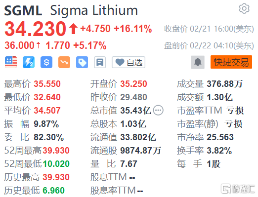 格隆汇2月22日丨上交易日逆势大涨16%的Sigma Lithium(SGML.US)今日盘前再度走强,现报36美元,涨幅5.2%。市场消息称,特斯拉在考虑收购电池金属生产商Sigma Lithium公司。不过目前的讨论还处于早期阶段,最终也可能不会达成交易。
