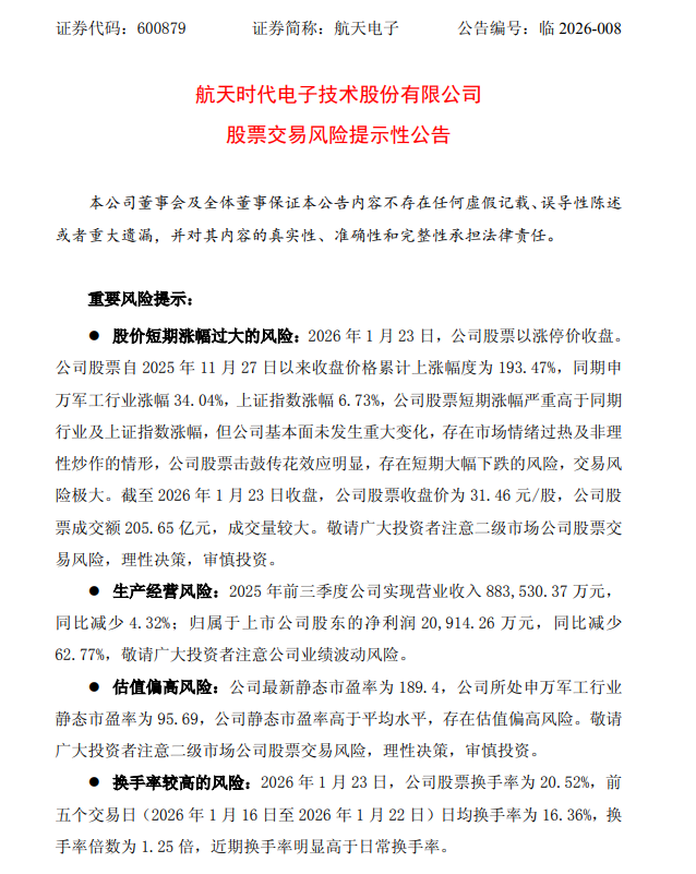 1月23日,航天电子(600879.SH)发布风险提示公告,2026年1月23日,公司股票以涨停价收盘。公司股票自2025年11月27日以来收盘价格累计上涨幅度为193.47%,同期申万军工行业涨幅34.04%,上证指数涨幅6.73%,公司股票短期涨幅严重高于同期行业及上证指数涨幅,但公司基本面未发生重大变化,存在市场情绪过热及非理性炒作的情形,公司股票击鼓传花效应明显,存在短期大幅下跌的风险,交易风险极大。截至2026年1月23日收盘,公司股票收盘价为31.46元/股,公司股票成交额205.65亿元,成交量较大。敬请广大投资者注意二级市场公司股票交易风险,理性决策,审慎投资。