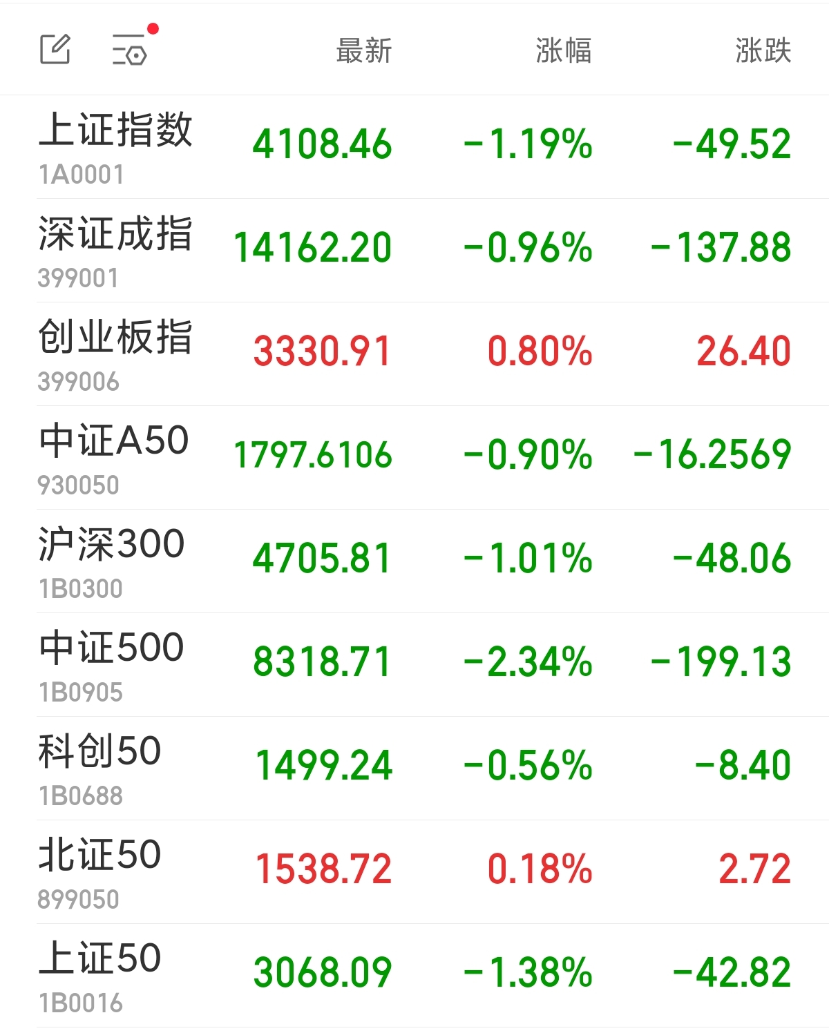 中新经纬1月30日电 周五,A股三大指数早盘走势分化,上证指数跌超1%。截至午间收盘,上证指数跌1.19%,报4108.46点;深证成指跌0.96%,报14162.20点;创业板指涨0.80%,报3330.91点。