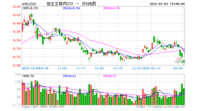 2月4日,恒生互联网ETF(513330)跌2.12%,成交额44.06亿元。当日份额增加18.88亿份,最新份额为721.23亿份,近20个交易日份额增加65.28亿份。最新资产净值计算值为363.65亿元。