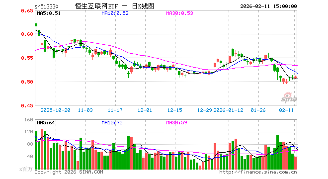 2月11日,恒生互联网ETF(513330)涨0.59%,成交额20.06亿元。当日份额减少800.00万份,最新份额为732.97亿份,近20个交易日份额增加65.74亿份。最新资产净值计算值为374.84亿元。