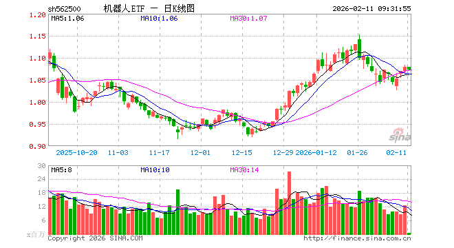 2月11日,机器人ETF(562500)开盘涨0.00%,报1.079元。机器人ETF(562500)重仓股方面,科大讯飞开盘跌0.62%,汇川技术跌0.47%,拓普集团跌0.40%,大华股份涨0.11%,大族激光跌0.40%,双环传动跌0.93%,石头科技跌0.34%,中控技术跌0.38%,绿的谐波跌0.44%,机器人跌0.57%。