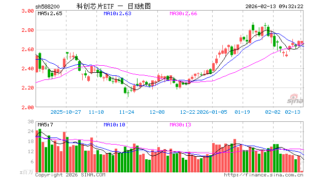 2月13日,科创芯片ETF(588200)开盘跌0.89%,报2.658元。科创芯片ETF(588200)重仓股方面,中芯国际开盘跌0.30%,海光信息跌0.89%,寒武纪跌1.12%,澜起科技跌0.78%,中微公司跌0.63%,拓荆科技跌0.34%,芯原股份跌2.78%,华虹公司跌0.73%,沪硅产业跌0.15%,东芯股份跌0.80%。