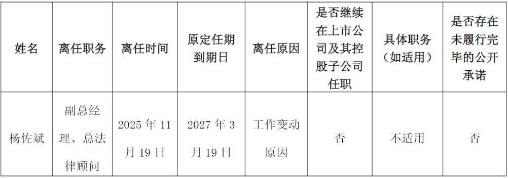 因工作变动原因,杨佐斌申请辞去公司副总经理、总法律顾问职务。辞职后,杨佐斌将不在公司担任任何职务。