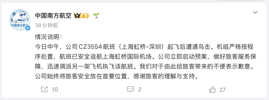 今日中午,公司CZ3554航班(上海虹桥-深圳)起飞后遭遇鸟击。机组严格按程序处置,航班已安全返航上海虹桥国际机场。公司立即启动预案,做好旅客服务保障,迅速调派另一架飞机执飞该航班。