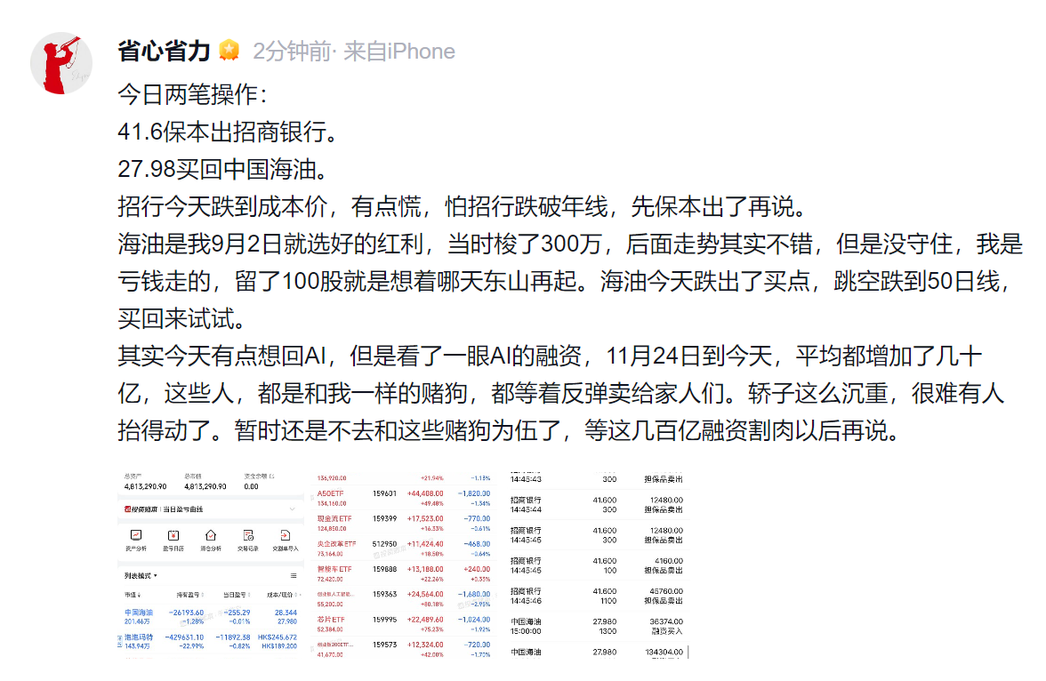 2、盘中63.01止损工业富联,亏损33860,二进宫失败,从周二的+13万到周四的-3万,两天时间,恍如隔世,认输。在工业富联上的总利润从27万减少到24万,不管怎么说,还是感谢工业富联,给了我一个A股回本的机会。怎么说呢,11月24日那个时间点,...