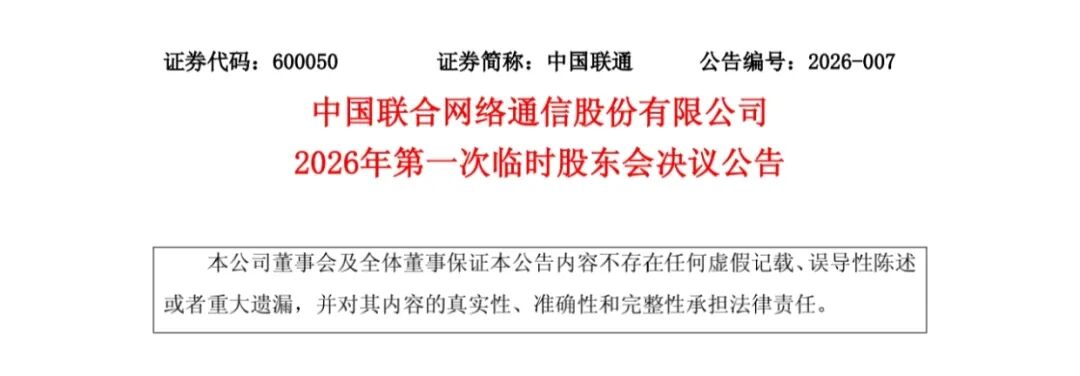 1月30日,中国联通(600050)发布《中国联合网络通信股份有限公司2026年第一次临时股东会决议公告》,本次临时股东会审议通过了《关于增补董昕先生为公司董事的议案》,同意率98.8%;审议通过了《关于增补杨宁先生为公司董事的议案》,同意率98.85%。