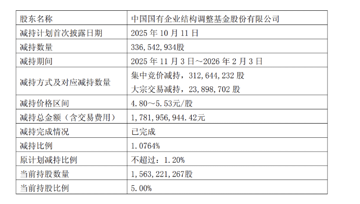 公告显示,2025年11月3日至2026年2月3日,结构调整基金已通过集中竞价方式累计减持公司股份约3.13亿股,占公司总股本的1%;通过大宗交易方式累计减持公司股份约2390万股,占公司总股本的0.0764%;合计减持公司股份约3.37亿股,占公司总股本比例为1.0764%。累计减持总金额(含交易费用)约17.82亿元。