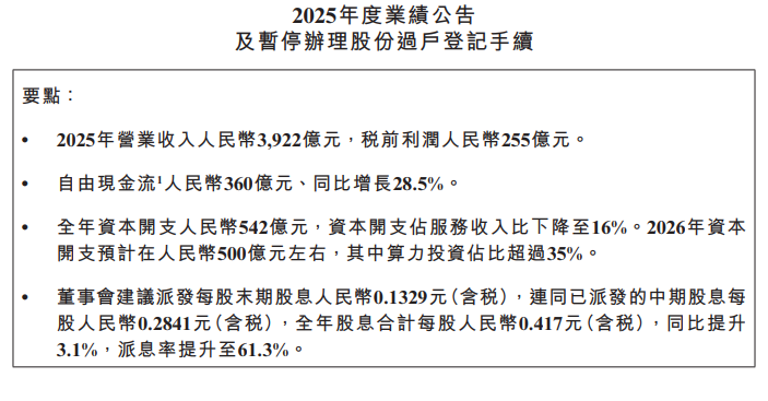 2025年营业收入人民币3922亿元,税前利润人民币255亿元。自由现金流人民币360亿元、同比增长28.5%。全年资本开支人民币542亿元,资本开支占服务收入比下降至16%。
