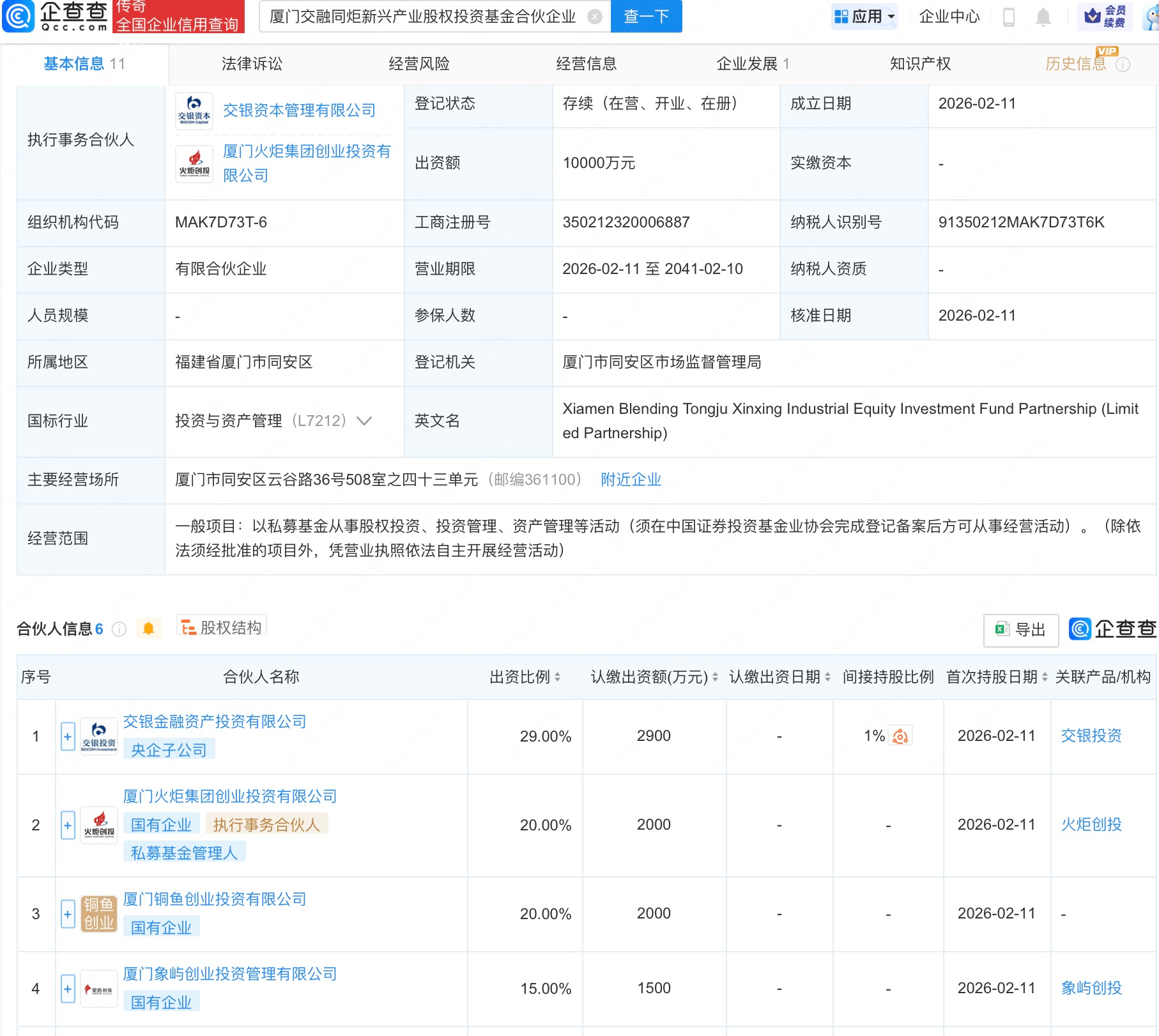 企查查APP显示,近日,厦门交融同炬新兴产业股权投资基金合伙企业(有限合伙)成立,出资额1亿人民币,经营范围为以私募基金从事股权投资、投资管理、资产管理等活动。企查查股权穿透显示,该企业由交银金融资产投资有限公司、厦门火炬集团创业投资有限公司、厦门象屿(600057)创业投资管理有限公司等共同出资。