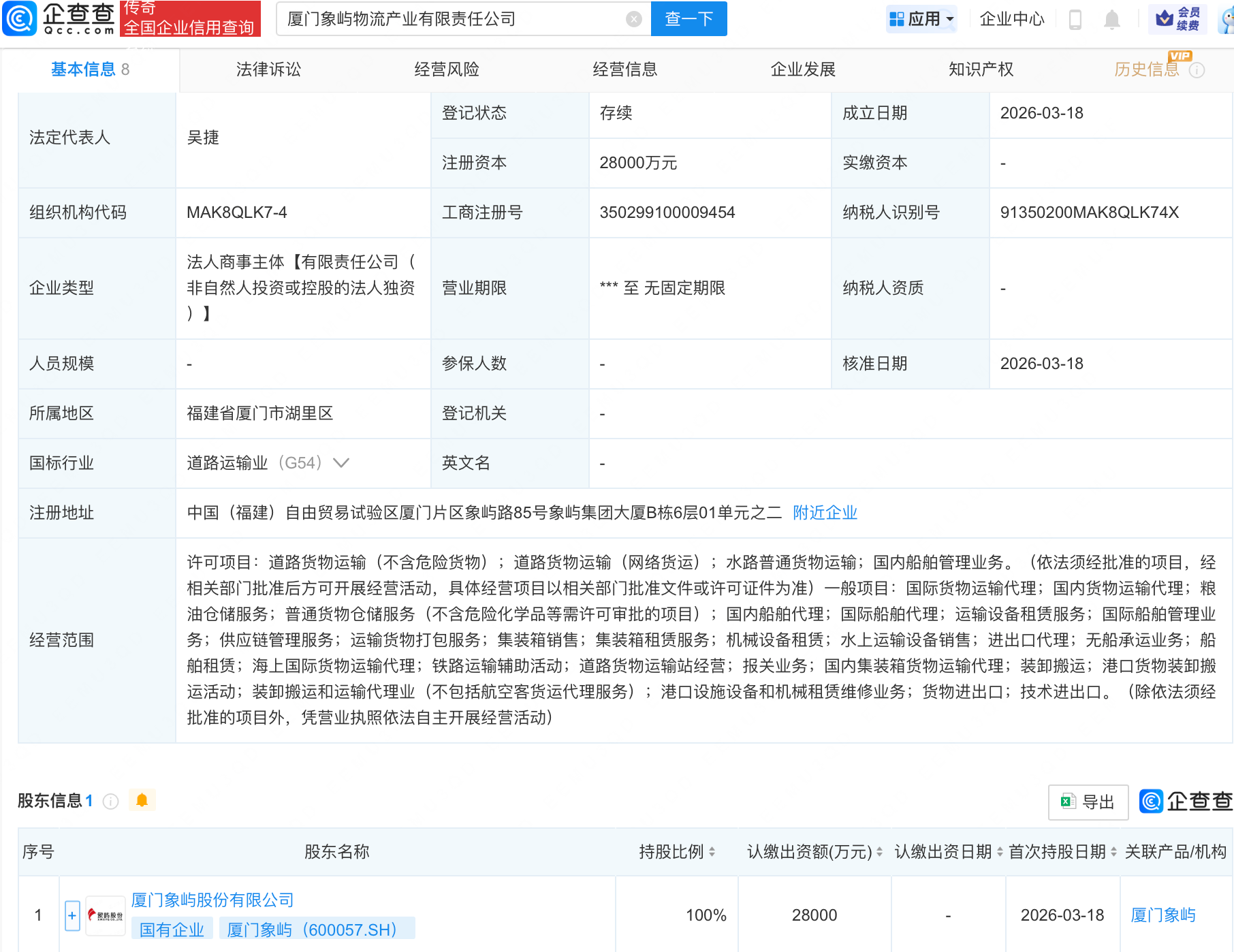 企查查APP显示,近日,厦门象屿(600057)物流产业有限责任公司成立,注册资本2.8亿元,经营范围包含:海上国际货物运输代理;铁路运输辅助活动;道路货物运输站经营;报关业务;国内集装箱货物运输代理等。企查查股权穿透显示,该公司由厦门象屿(600057.SH)全资持股。