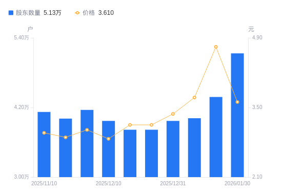 近一年(2025年2月10日至2026年1月30日),康欣新材A股股东户数从4.08万户,增加至5.13万户,增幅25.82%,区间股价上涨77.83%。