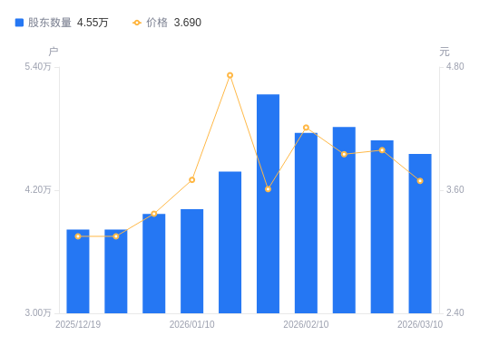 近一年(2025年3月10日至2026年3月10日),康欣新材A股股东户数从5.12万户,减低至4.55万户,降幅11.07%,区间股价上涨66.97%。