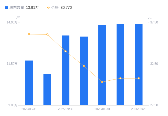 3月30日消息,数据显示,截至2025年12月31日,同仁堂A股股东总户数为13.15万户,较上期(2025年9月30日)减少710户,降幅0.54%。公司最新A股总股本为13.71亿股,其中流通A股13.71亿股,户均持有流通A股数量为1.04万股,较上期增加56.01股,增幅0.54%;户均持流通A股市值33.65万元,较上期减少1.65万元,降幅4.66%。