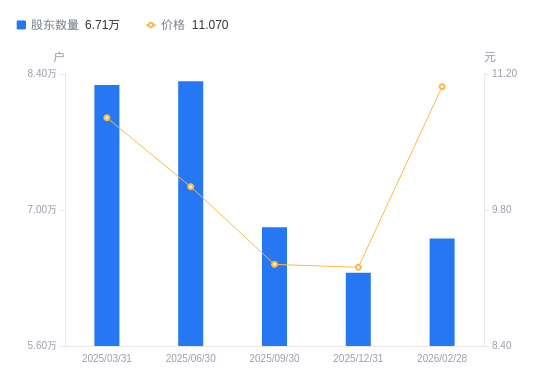 近一年(2025年2月28日至2026年2月28日),明星电力A股股东户数从6.17万户,增加至6.71万户,增幅8.68%,区间股价上涨26.80%。