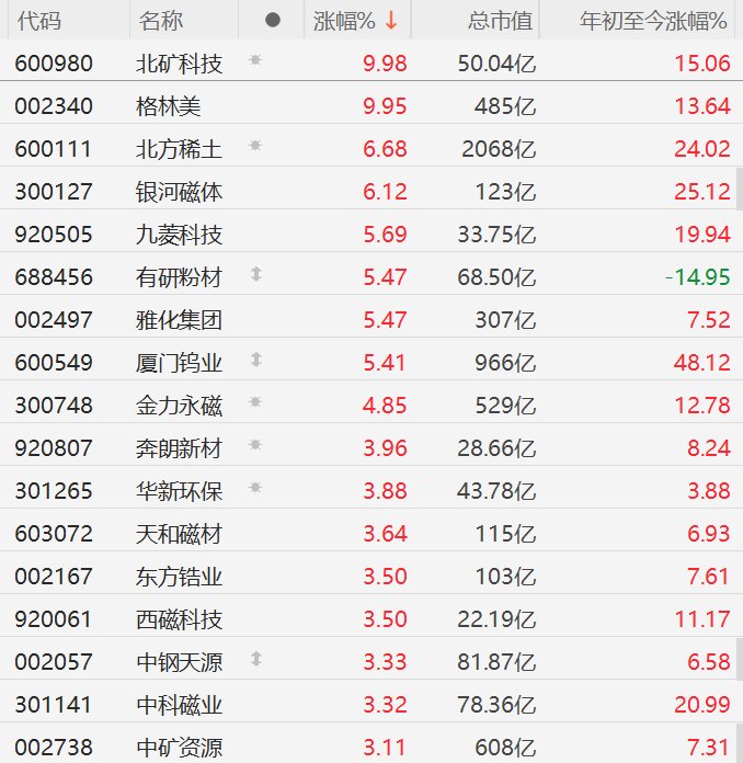 格隆汇2月11日|A股市场稀土永磁板块集体走强,其中,北矿科技、格林美涨停,北方稀土、银河磁体涨超6%,九菱科技、有研粉材、雅化集团、厦门钨业涨超5%,金力永磁涨近5%。