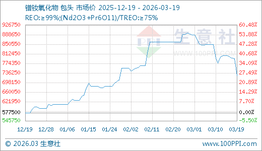 据生意社监测,镨钕氧化物03月19日最新价格725000.00元/吨,最近60天上涨6.23%,90天上涨25.54%。
