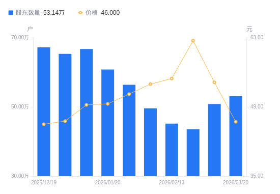 3月30日消息,数据显示,截至2026年3月20日,北方稀土A股股东总户数为53.14万户,较上期(2026年3月10日)增加2.31万户,增幅4.54%。公司最新A股总股本为36.15亿股,其中流通A股36.15亿股,户均持有流通A股数量为6803.29股,较上期减少308.69股,降幅4.34%;户均持流通A股市值31.3万元,较上期减少7.09万元,降幅18.47%。